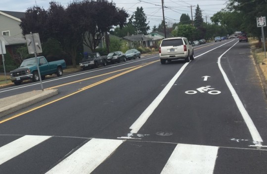 Maus points to several examples of bike lanes and crosswalks striped in conjunction with a repaving. He writes: “While these bicycle access improvements are still just paint and not the true, physically protected bikeways many Portlanders are yearning for, at least PBOT is claiming space and moving in the right direction.”